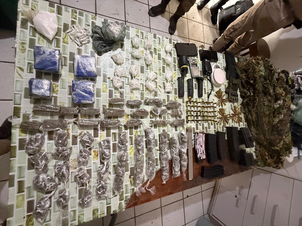 Entre os itens apreendidos estão uma granada defensiva, carregadores de fuzil calibre 5.56, carregadores de pistola e submetralhadora, munições de diferentes calibres, balanças de precisão, rádios comunicadores, além de mais de 900 porções de maconha e cocaína, já fracionadas para comercialização.