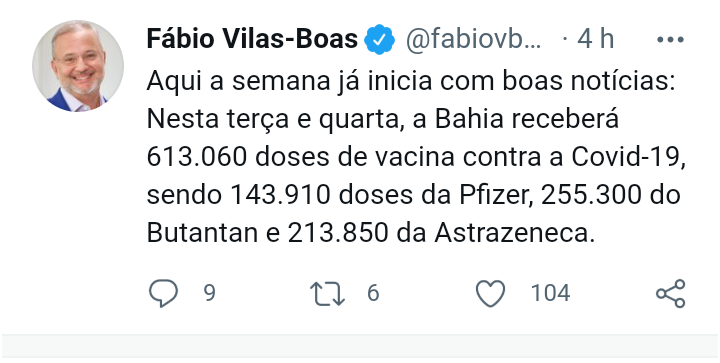 A Bahia vai receber 613 mil doses de vacinas contra a Covid-19 nesta terça (27) e quarta (28). A informação foi divulgada pelo secretário estadual da Saúde (Sesab), Fábio Vilas-Boas, na manhã desta segunda-feira (26).