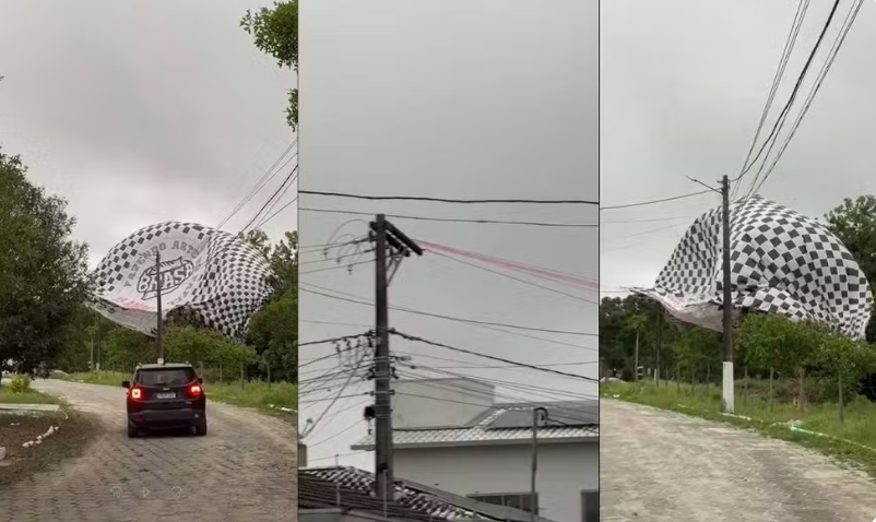 Imagens gravadas por moradores mostram o momento em que o balão se enrosca nos fios e postes de energia, antes de atingir árvores e telhados. O episódio aconteceu no sábado (25) e mobilizou equipes do Corpo Regional de Bombeiros Militar (CRBM – Sul).