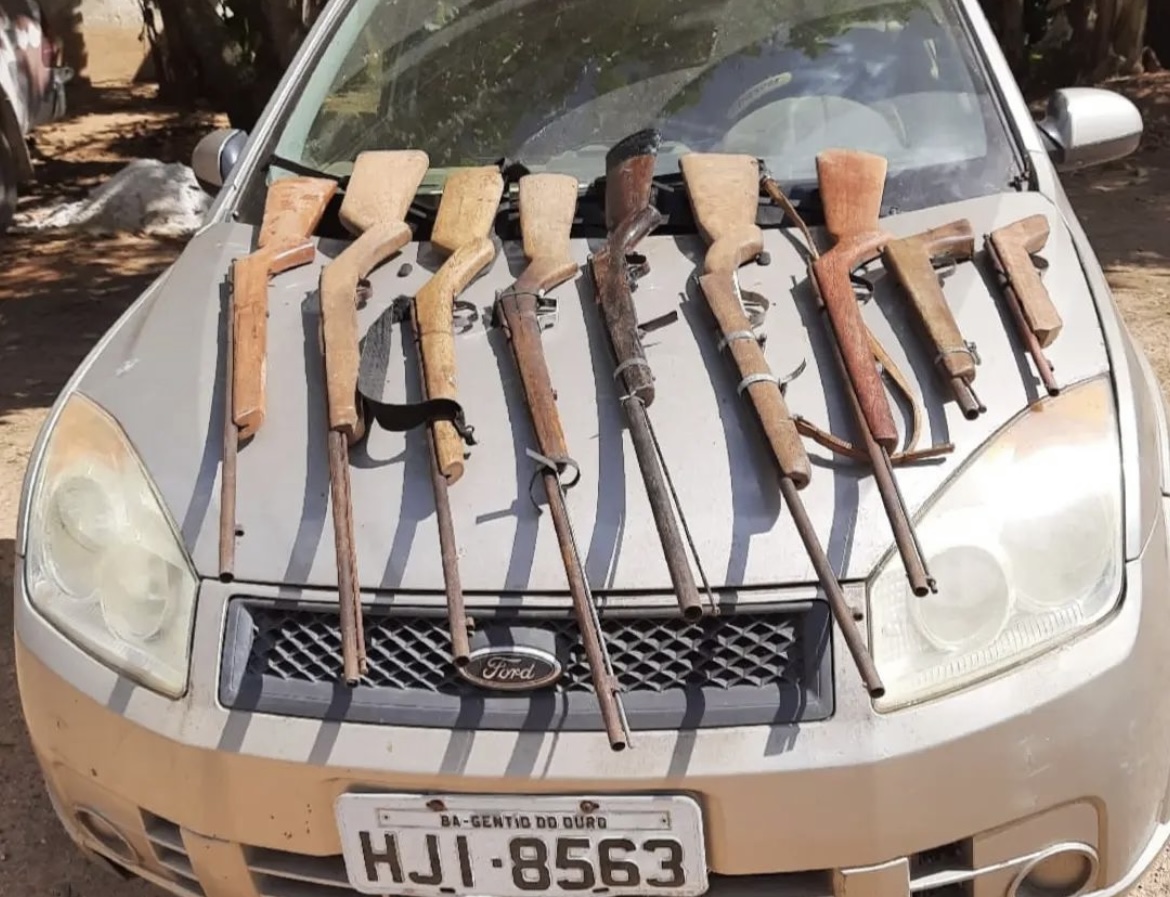 Durante a busca no veículo, foram encontradas 09 armas de fogo artesanais, e também após consultas no sistema foi constatado restrição de roubo/furto do mesmo.