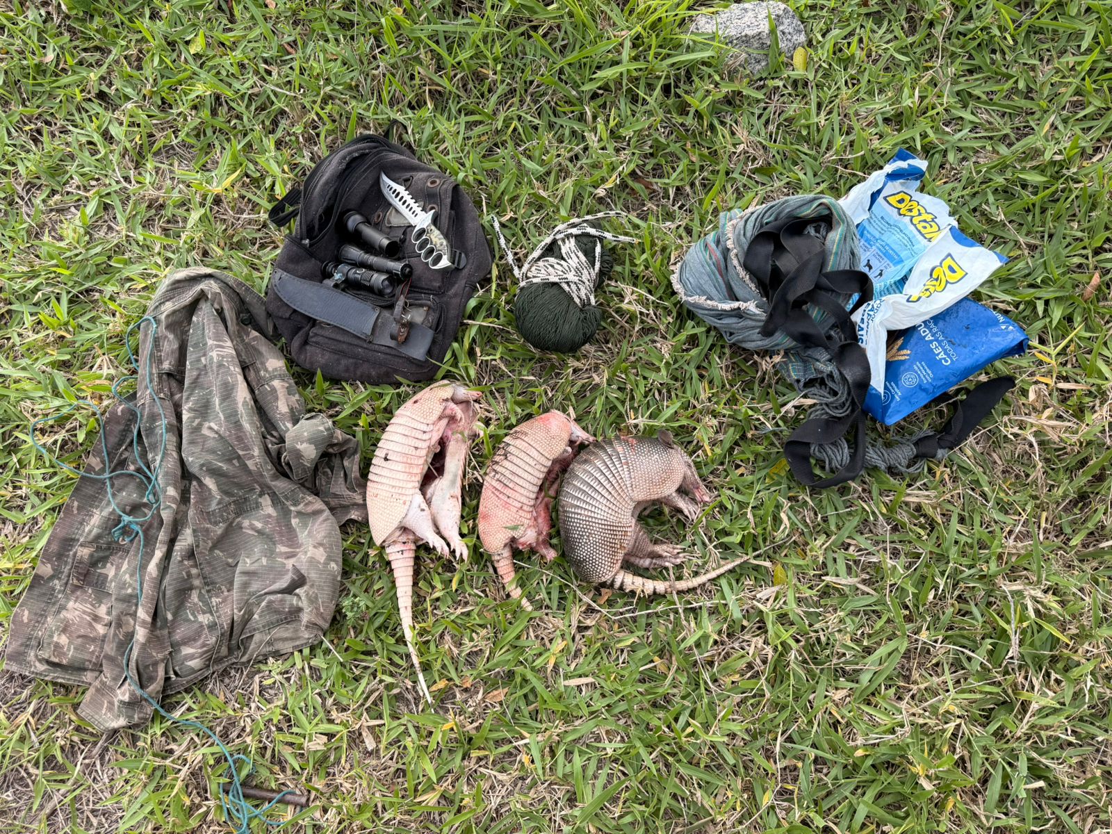 No percurso utilizado pelos fugitivos, os militares encontraram um arsenal e evidências do crime ambiental. Foram apreendidas quatro espingardas da marca Boito, nos calibres .32, .40 e duas de calibre .36, além de uma espingarda de fabricação artesanal. Também foram recolhidas 22 munições intactas, nos calibres .36 e .40, e três tatus já abatidos.