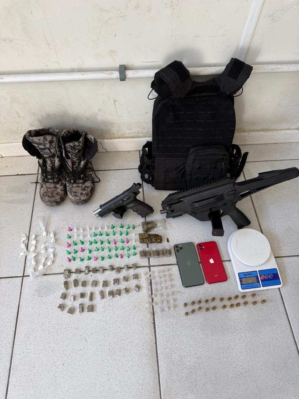 Entre os itens apreendidos estão armas de fogo, munições, entorpecentes, balança de precisão e aparelhos celulares.