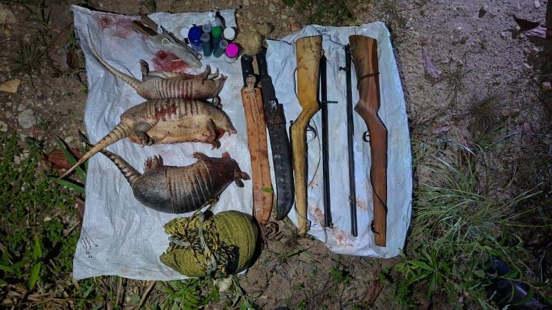 De acordo com a ocorrência, prepostos da empresa GPS informaram à PM que haviam contido os suspeitos com três tatus abatidos. Ao chegar ao local, a guarnição confirmou a situação. Os indivíduos não resistiram à abordagem e indicaram onde estavam escondidas as armas utilizadas.