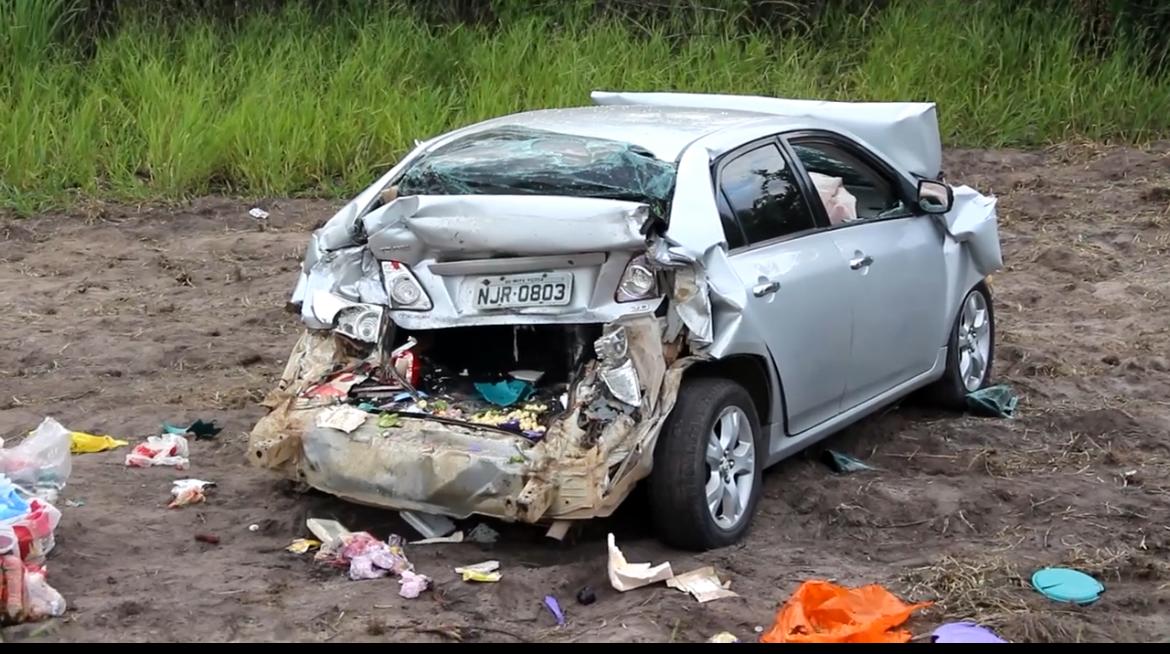 Uma carreta também se envolveu na colisão e deixou o fundo de um carro completamente destruído. O motorista não se feriu.