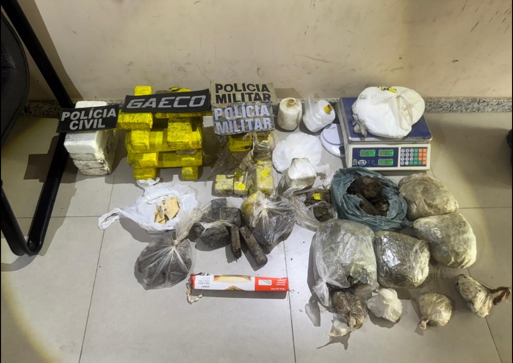 Durante o cumprimento de dois mandados de busca e apreensão expedidos pela 1ª Vara Criminal da Comarca de Eunápolis, as equipes localizaram e apreenderam quatro tabletes de cocaína, trinta e um tabletes de maconha, seis pacotes avulsos da mesma droga, quatro porções de maconha do tipo skank, quatro sacolas plásticas contendo cocaína, quatro porções de pasta base de cocaína e uma sacola com fragmentos de crack.