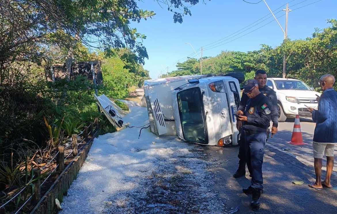 Um caminhão de gelo tombou na manhã dessa terça-feira na Orla Norte de Porto Seguro, bem próximo à Cabana Barramares. Ainda não há detalhes sobre o que provocou o acidente, segundo informações, o motorista perdeu o controle e acabou tombando.