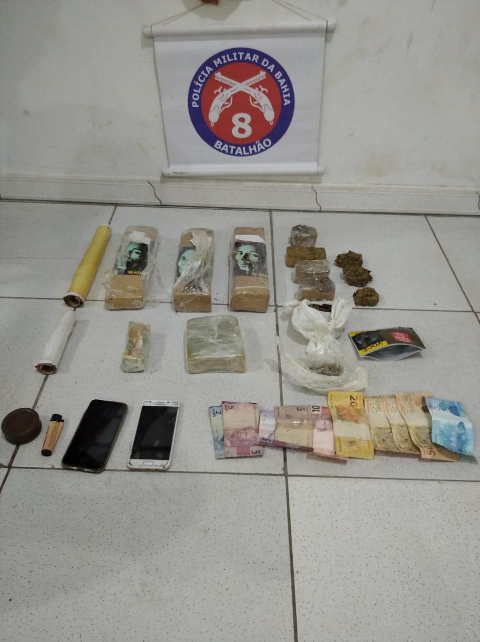 Em ato continuo, a guarnição se dirigiu a um imóvel usado pelos suspeitos, onde foram encontrados 3,357 Kg de maconha prensada, 770 gramas de crack, R$ 297,00 em espécie, 02 celulares e materiais para embalar drogas.
