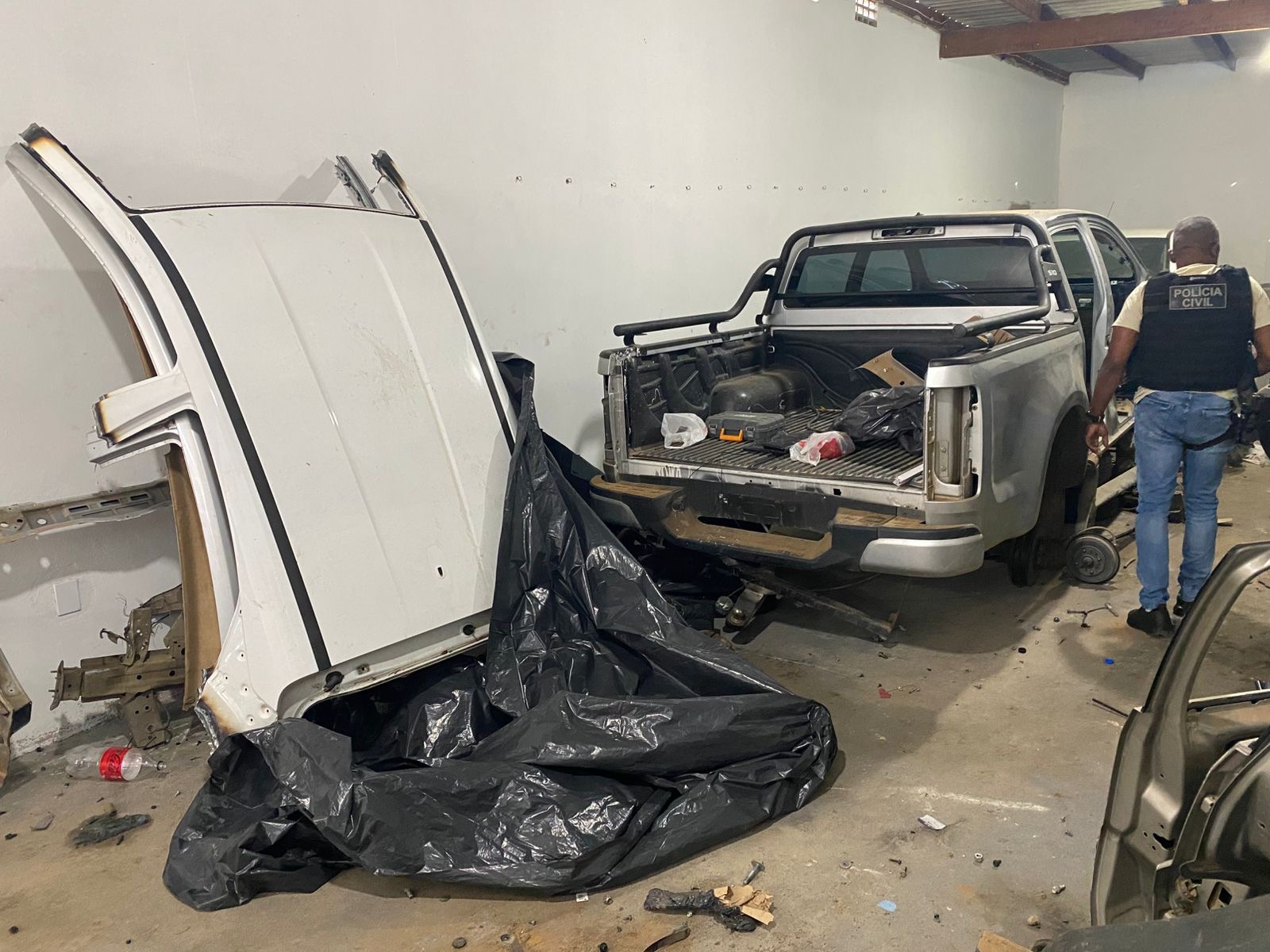 No local, foram apreendidos veículos, motores e componentes mecânicos com restrição de roubo ou sinais identificadores adulterados, além de ferramentas utilizadas para desmontagem. Entre os materiais apreendidos estão uma caminhonete Ford Ranger, uma Fiat Fiorino com motor adulterado e uma Fiat Strada branca já desmontada, além de diversas peças e componentes de ao menos cinco veículos distintos, muitos deles com etiquetas e sinais de identificação suprimidos.