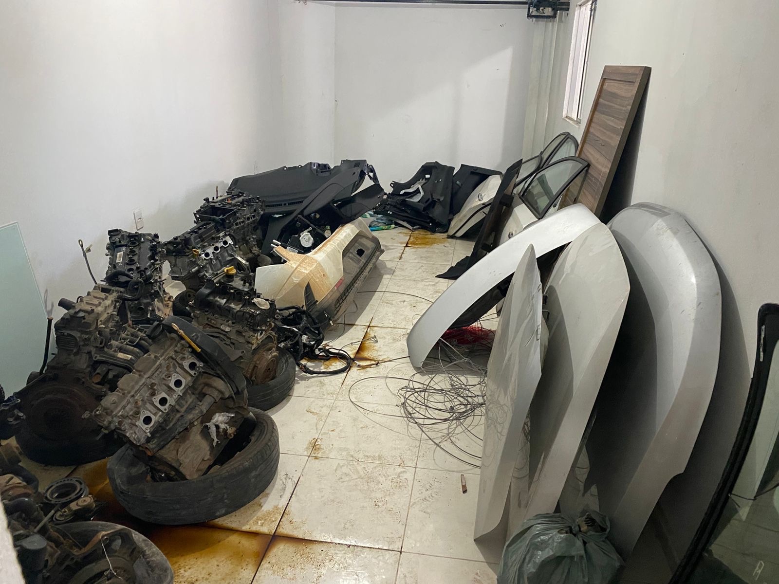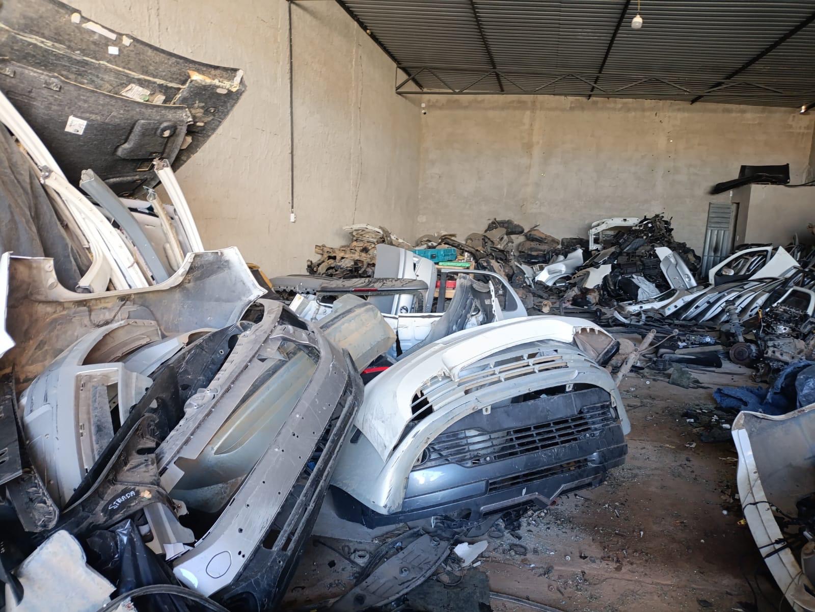 Foram encontradas portas, para-choques, sistemas de suspensão, centrais eletrônicas, bancos, volantes, rodas, faróis, lanternas, capôs, retrovisores e outros acessórios, organizados em prateleiras, sacos e paletes, o que evidencia a atuação reiterada e em larga escala do esquema criminoso. Também foram localizadas etiquetas veiculares, motores com numeração raspada, placas de origem não justificada, além de ferramentas e insumos usados para o desmonte e adulteração dos veículos.