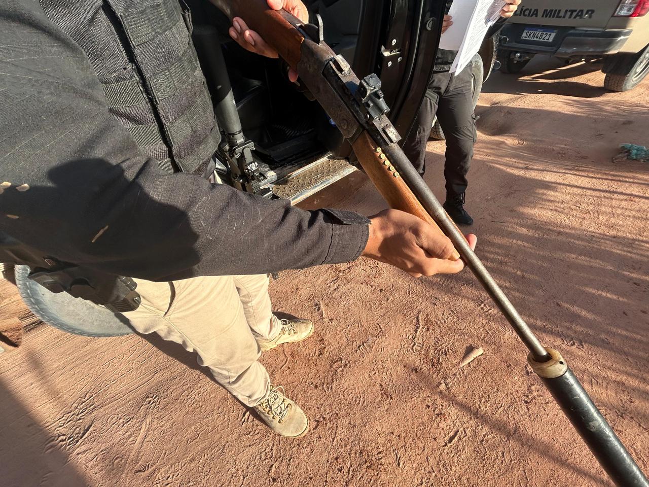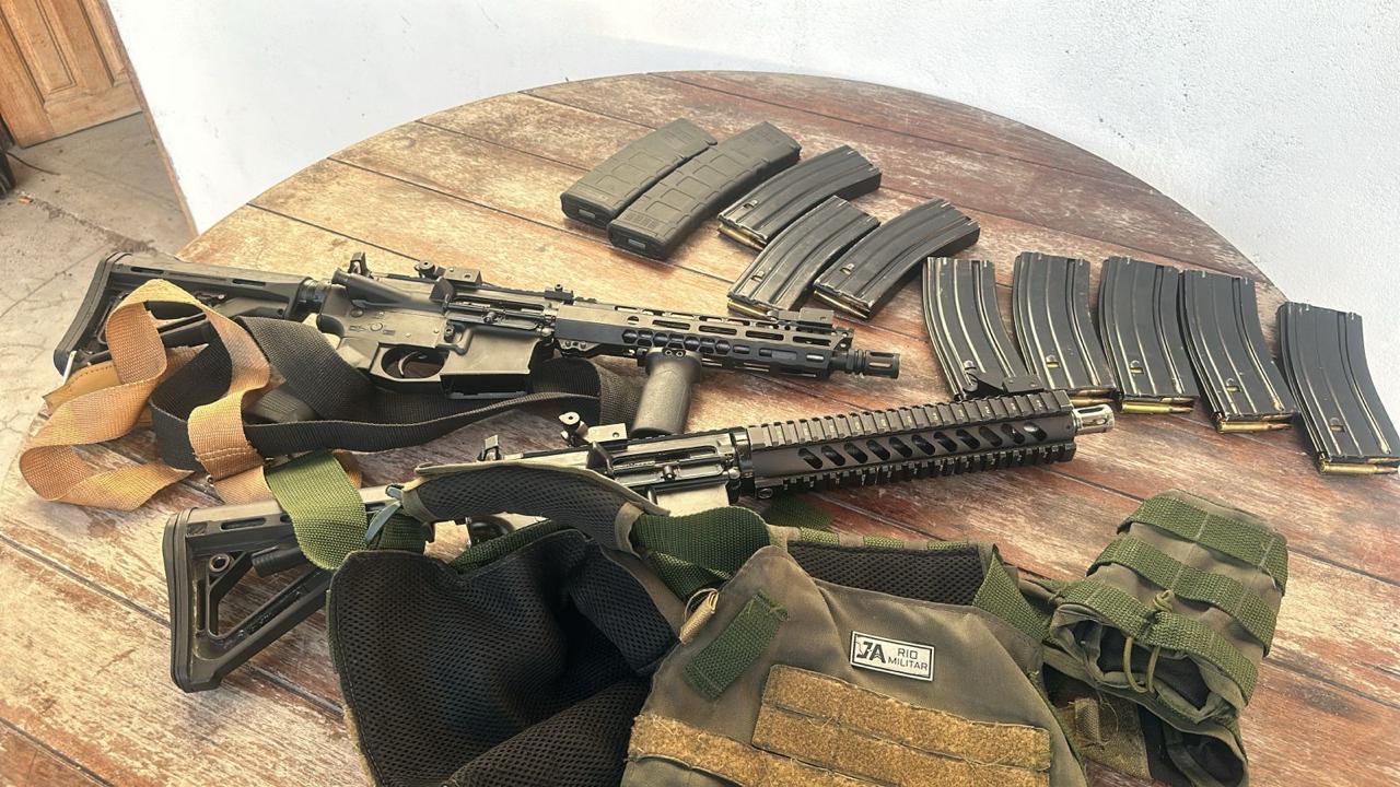 Na ação, foram apreendidos dois fuzis, um rifle calibre 22, munições diversas, um tablete de maconha, porções embaladas da droga, pinos de cocaína, celulares e materiais comumente utilizados no preparo e comércio de substâncias ilícitas.