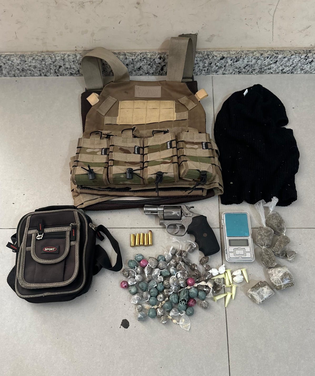 A polícia militar apreendeu na manhã desta terça-feira (06), arma de fogo, colete, munições e drogas, no município de Eunápolis, no Sul da Bahia.