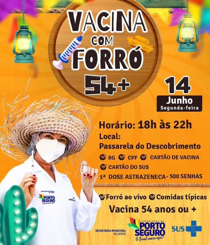 Nessa segunda-feira (14) a prefeitura de Porto Seguro inicia a vacinação de pessoas com 54 anos ou mais. A imunização de pessoas com 18 anos que tenha comorbidade também continua.